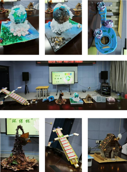 比赛中,各参赛队伍作品风格迥异,充分展现了同学们的创作才华,为校园文化注入满满活力。作品展示现场亮点纷呈,废旧材料被巧变为生机地球、亮灯小屋、音乐吉他等创意成果,环保与创意完美融合。
