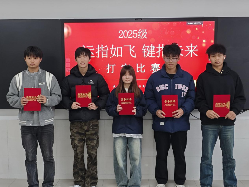 经过近一个多小时的紧张比拼,评委团根据选手的录入速度、准确率等指标综合评分,最终评选出一等奖5 名、二等奖 10 名、三等奖 15 名。来自25级大数据专业的贾爱琦,25级网络技术专业的聂丹,25级软件技术专业的陈将、秦洋晟、李鸿瑞斩获一等奖。